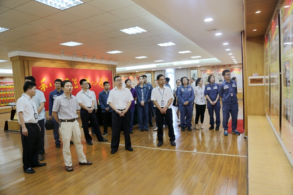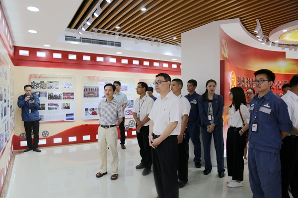 贵港市供电局电力调度中心党支部书记李继斌(前中)参观港北法院文化展馆